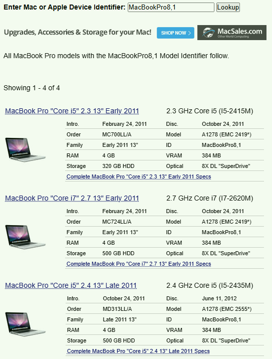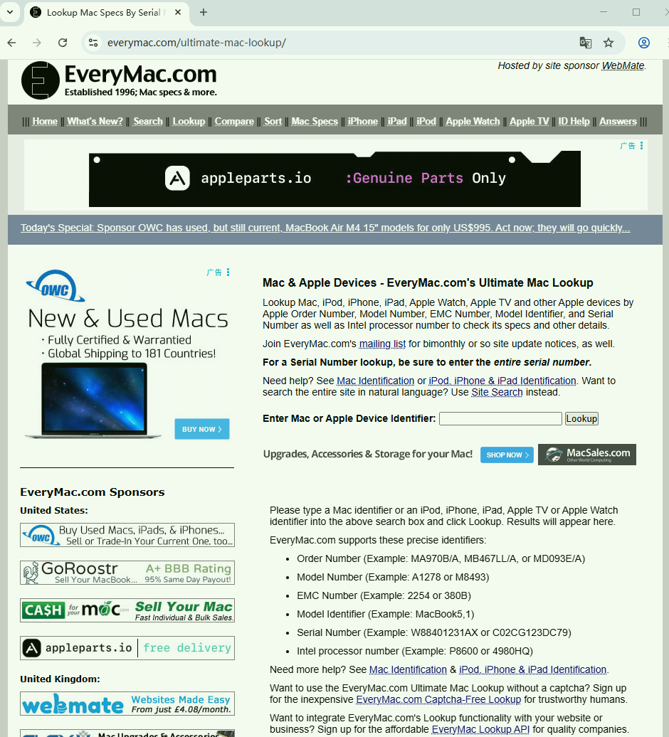 👉 “序列号”(如MFFVFX12345678)- 根据 型号标识 与 序列号 在 https://everymac.com/ultimate-mac-lookup/ 输入序列号 查询对应的具体型号。