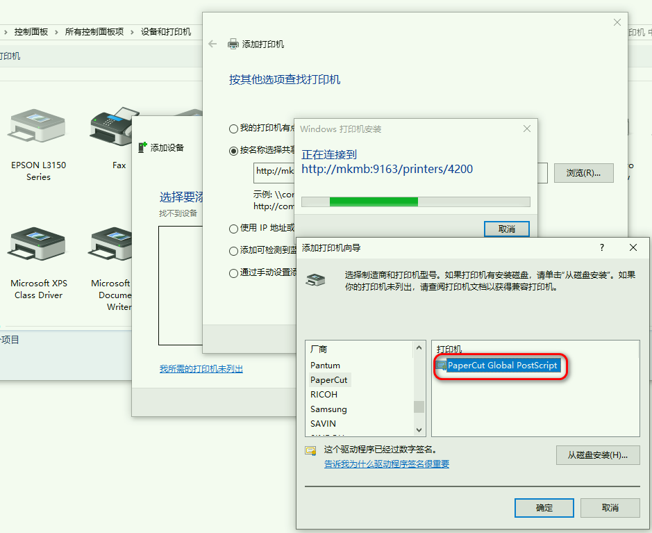 用Windows ipp方式连接打印机,只支持PCL驱动,不支持GDI驱动,必须使用PaperCut Mobility Print 提供的安装网址下载才能兼容所有驱动并正常打印:http://计算机名称:9163/setup 。
